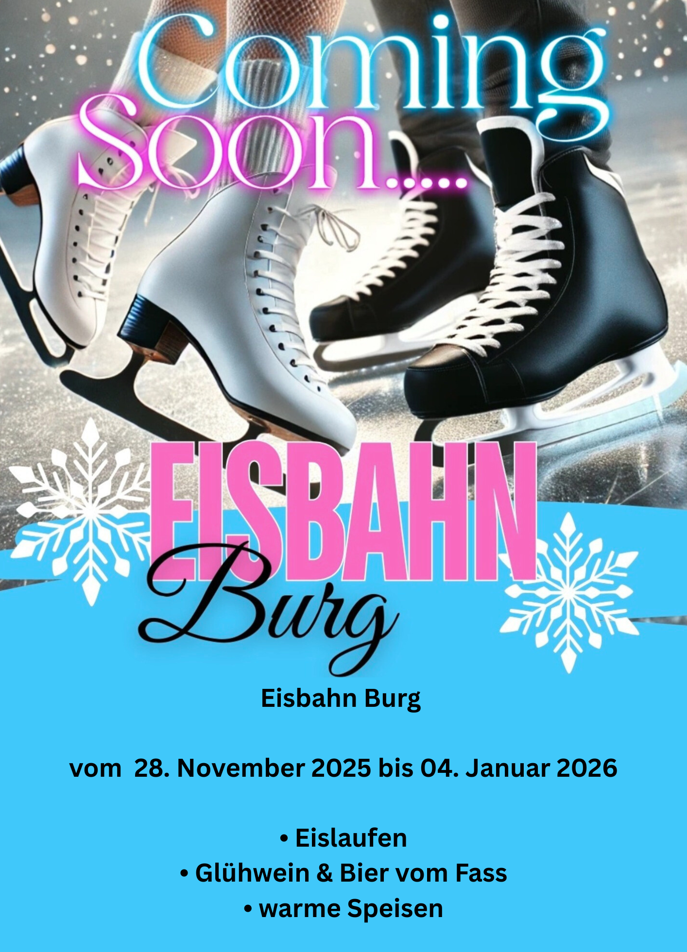 Wir freuen uns euch auch diese Jahr wieder auf unserer Eisbahn in Burg willkommen heißen zu dürfen. Ab dem 28. November dürft Ihr wieder eure Bahnen ziehen bei stimmiger Musik, einem heißen Getränk und ordentlicher Verpflegung!